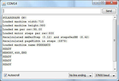 Una vez hecho eso, usted debe confirmar que está funcionando adecuadamente - uso el serial monitor en el tablero, situado a 57600 baudios para asegurarse de que está emitiendo "listo" cada dos segundos (ver última imagen).