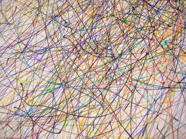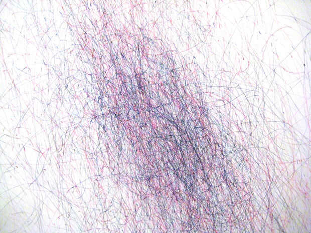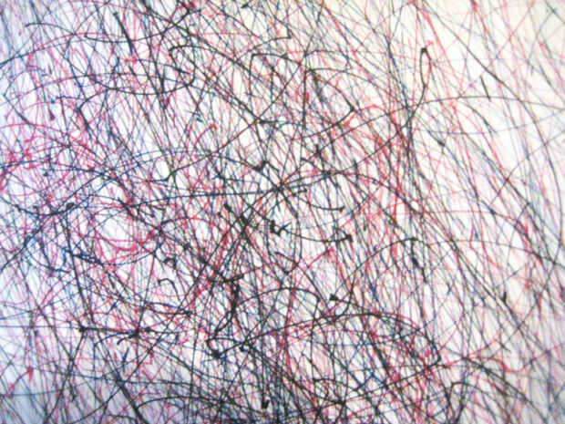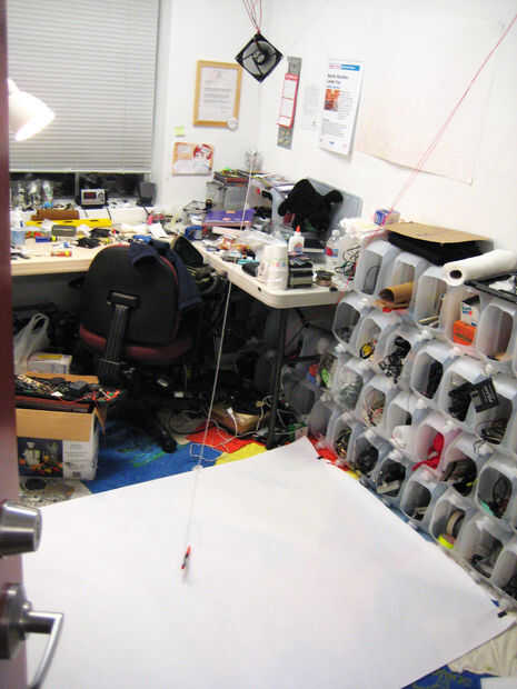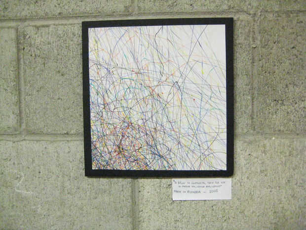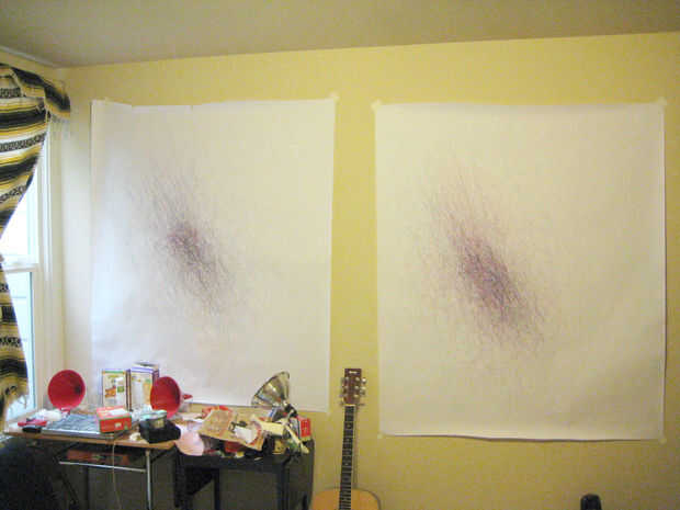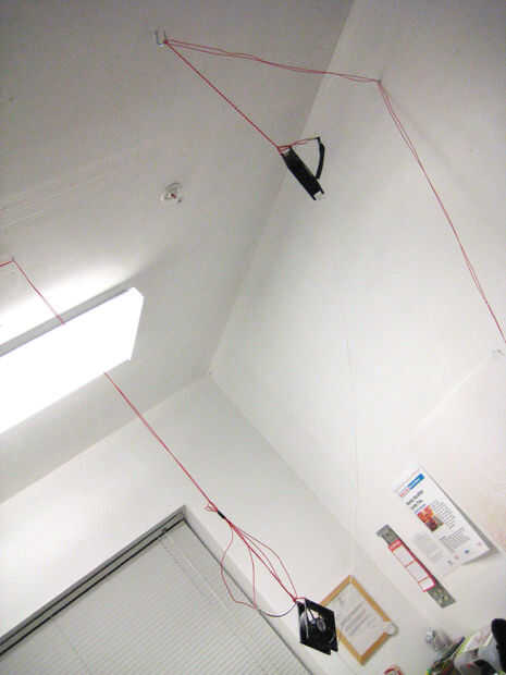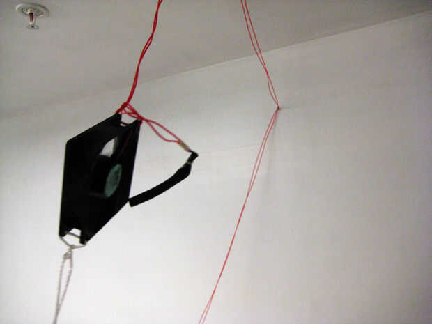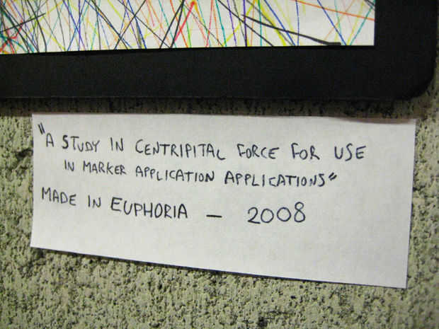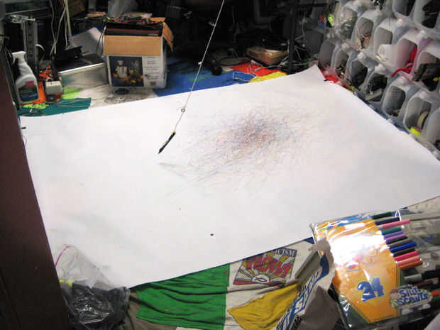 La primera iteración de la máquina involucrada un ventilador de ordenador colgado del techo por su propio cable. Suspendido del ventilador era un trozo largo de cuerda con un marcador sobre el final. Como el ventilador sí mismo alrededor, arrastra el marcador en una gran hoja de papel que blanco en el piso. En ocasiones el marcador rebotar violentamente de personas o cosas. Cuando la máquina funcionó, me sentó hacia fuera en el pasillo en una silla plegable con mi laptop normalmente y esperó pacientemente. Un dibujo típico llevó unos 30 minutos a una hora (incluso con un par de cambios de marcador).