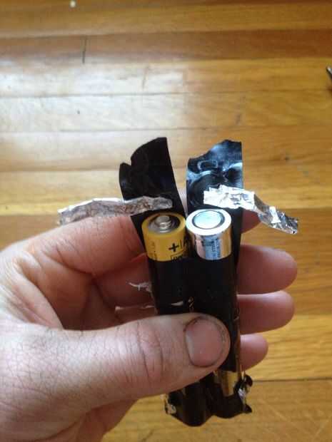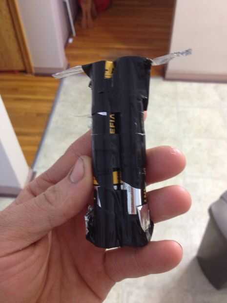 Ahora con cinta adhesiva las dos baterías codo a codo con el positivo en un paquete hacia arriba y en el paquete de la batería hacia abajo.