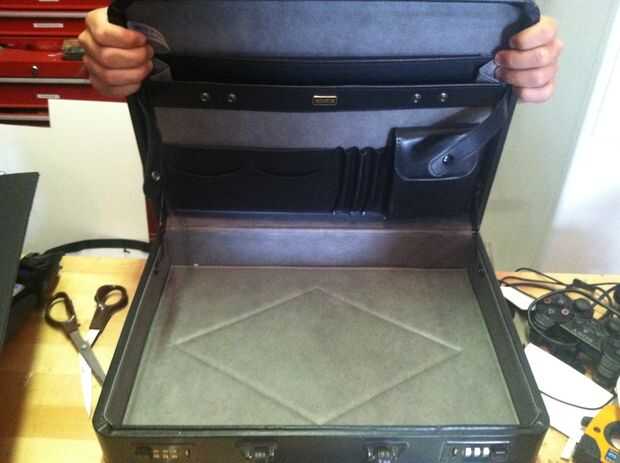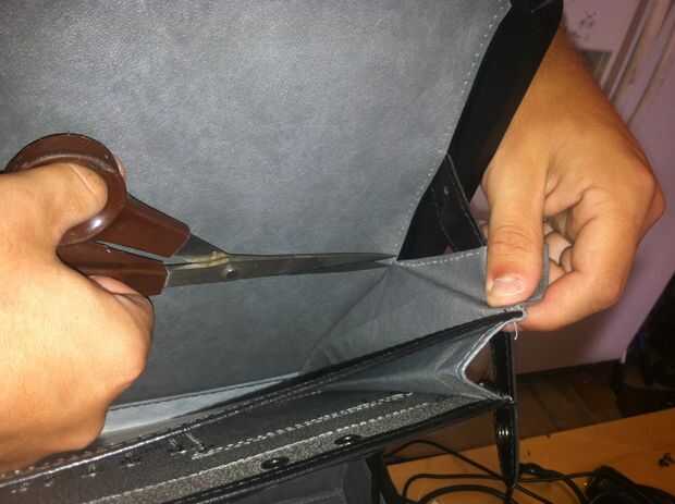 Agarra su maletín y cortar todas las aletas y bolsillos. Esto nos permitirá poner la espuma más uniformemente. Una vez que todas las aletas se cortan y las superficies interiores son planas, pasemos al siguiente paso.
