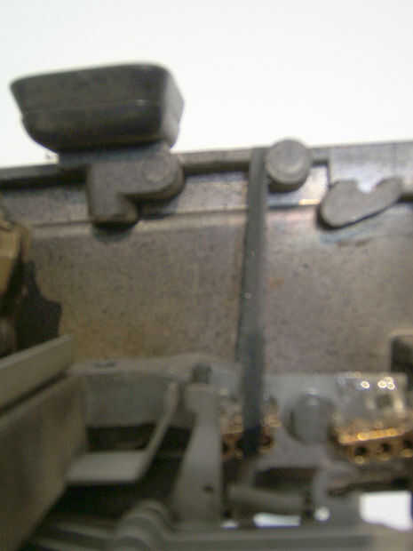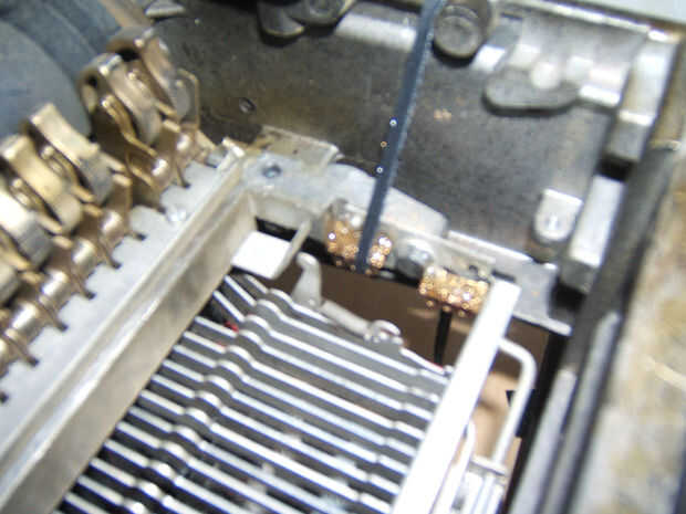 Esencialmente los soportes se pegan al interior de la caja, boca abajo (porque no olvidemos la máquina de escribir sigue siendo boca abajo). Debe haber uno pegado a cada lado de ese perno grande (ver imagen).