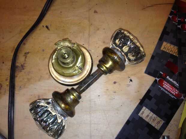 Para obtener las perillas de cristal de su eje, con cuidado que cortar a través de un collar de cobre amarillo que fue aplastado alrededor de cada perilla. Usé una dremel rueda corte hacerlo cortando muy lentamente a través de entonces usando unas pinzas para sacar los metales aparte.