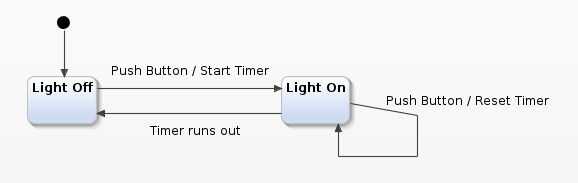 Un ejemplo muy básico de un FSM se encuentra en muchas casas: apretar un botón activa la luz de la escalera. Después de cierto tiempo, la luz se apaga automáticamente. Podría de este modelo como un FSM con dos Estados: encendido y apagado. Hay una transición de un estado a otro y viceversa y la condición es pulsar el botón en una sola dirección y que ha pasado un cierto tiempo en la otra dirección. Podemos modelar este comportamiento en un diagrama, el diagrama de estado supuesto. Echa un vistazo al cuadro 1.
