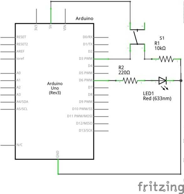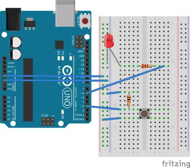 Botones tienen cuatro pines, por favor que estos siempre están conectados y que están conectadas al pulsar el botón. Luego, conecta el pin digital (3 se utiliza aquí) a un lado y un resistor de desconexión a tierra. Esto deja el pin de "flotante", un estado indefinido y mantiene en 0 voltios. Cuando se presiona el botón y del otro lado está conectado a VCC, que lado es "más fuerte" porque no tiene ninguna resistencia y el voltaje va a 5 voltios – básicamente un divisor de voltaje en una resistencia es 0 Ohms. Utilice una resistencia bastante alta, ya que limita el pasando actual a través del botón. 1 kR es el mínimo.