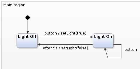 #include "Arduino.h"#include "avr/sleep.h" #include "src-gen/LightCtrl.h" #include "src-gen/LightCtrlRequired.h" #include "scutil/sc_timer_service.h"#define BUTTON_PIN 3 #define LED_PIN 6 #define MAX_TIMERS 20 //number of timers our timer service can use #define CYCLE_PERIOD 10 //number of milliseconds that pass between each statechart cyclestatic unsigned long cycle_count = 0L; //number of passed cycles static unsigned long last_cycle_time = 0L; //timestamp of last cycle static LightCtrl lightctrl; static sc_timer_service_t timer_service; static sc_timer_t timers[MAX_TIMERS];//! callback implementation for the setting up time events void lightCtrl_setTimer(LightCtrl* handle, const sc_eventid evid, const sc_integer time_ms, const sc_boolean periodic){ sc_timer_start(&timer_service, (void*) handle, evid, time_ms, periodic); }//! callback implementation for canceling time events. void lightCtrl_unsetTimer(LightCtrl* handle, const sc_eventid evid) { sc_timer_cancel(&timer_service, evid); }void lightCtrlIface_setLight(const LightCtrl* handle, const sc_boolean lightOn) { if(lightOn) digitalWrite(LED_PIN, HIGH); else digitalWrite(LED_PIN, LOW); }//The setup function is called once at startup of the sketch void setup() { pinMode(BUTTON_PIN, INPUT); pinMode(LED_PIN, OUTPUT); sc_timer_service_init( &timer_service, timers, MAX_TIMERS, (sc_raise_time_event_fp) &lightCtrl_raiseTimeEvent ); lightCtrl_init(&lightctrl); //initialize statechart lightCtrl_enter(&lightctrl); //enter the statechart }// The loop function is called in an endless loop void loop() { unsigned long current_millies = millis(); if(digitalRead(BUTTON_PIN)) lightCtrlIface_raise_button(&lightctrl); if ( cycle_count == 0L || (current_millies >= last_cycle_time + CYCLE_PERIOD) ) { sc_timer_service_proceed(&timer_service, current_millies - last_cycle_time); lightCtrl_runCycle(&lightctrl); last_cycle_time = current_millies; cycle_count++; } } También, revisa el código en este esencial con números de línea.