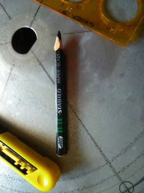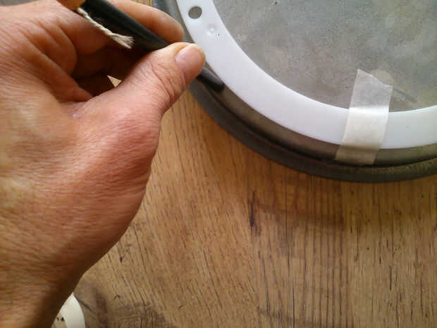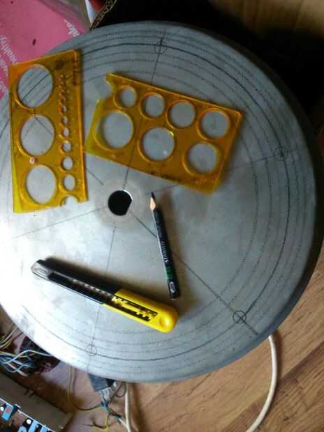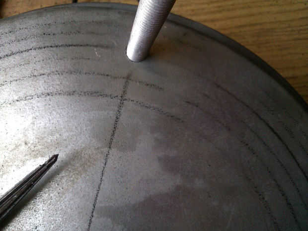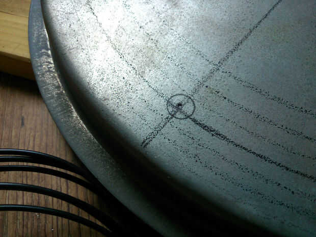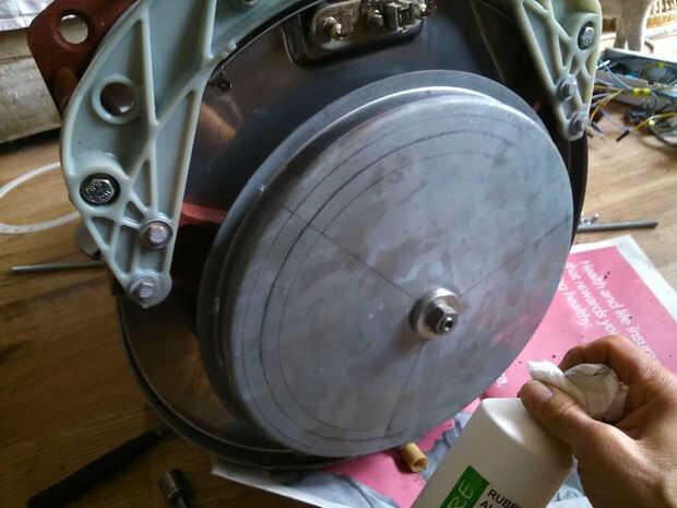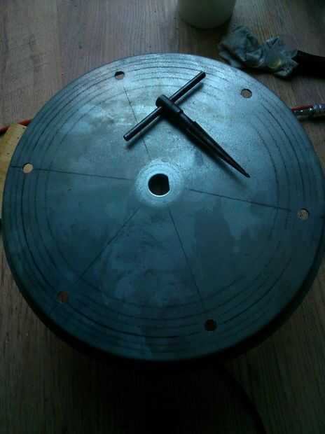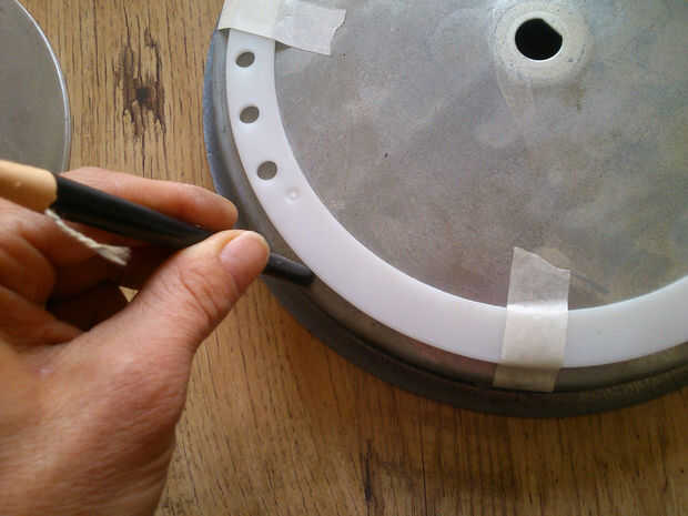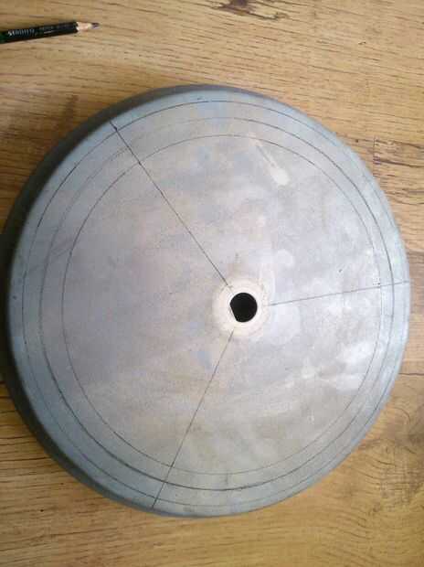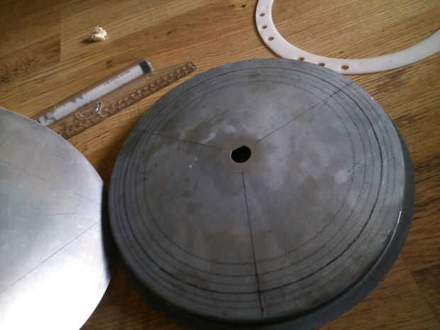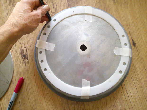 Una vez que la polea estaba hacia fuera. llegó el momento de encontrar el centro de la cual me puedo marca seis puntos para taladrar los agujeros. Esto también demostró ser un reto, como ya había un gran agujero en su centro, pero por suerte este plástico anillo que también vinieron de la máquina, actuada como una plantilla en ayudarme a encontrar esos puntos cruciales.