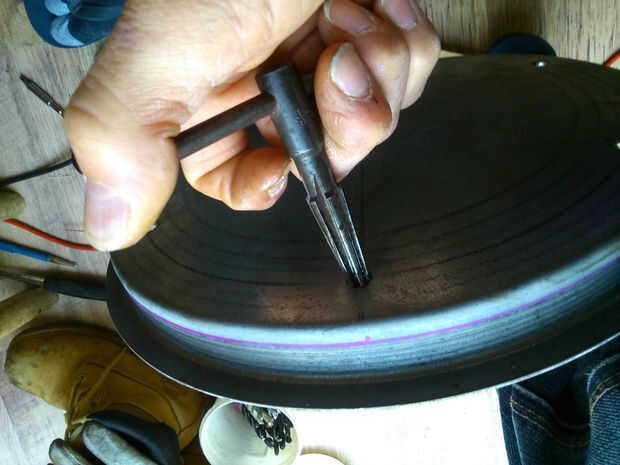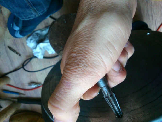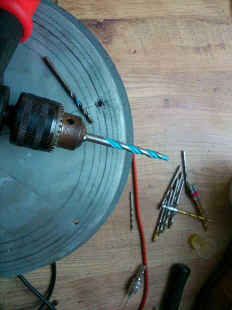 Finalmente encontró una broca que hizo un hueco con la ayuda de abundante cantidad de aceite de motor. Desafortunadamente esa broca solitario era sólo 3mm de diámetro. El agujero que quería abrir era de al menos 10mm y seis de ellos.