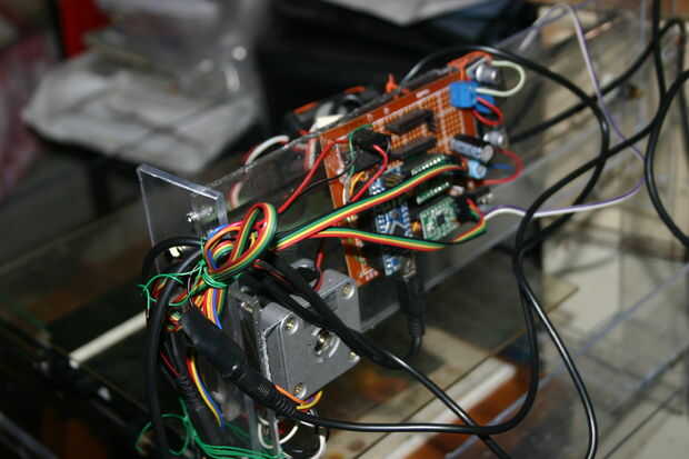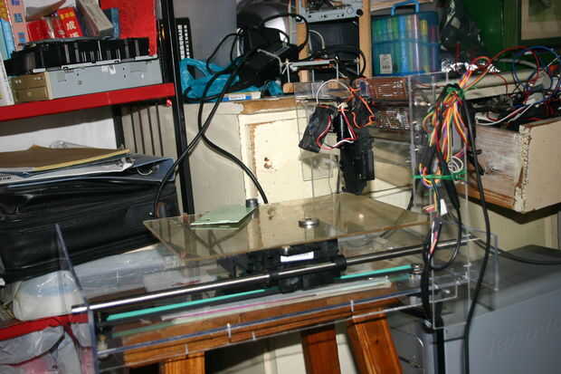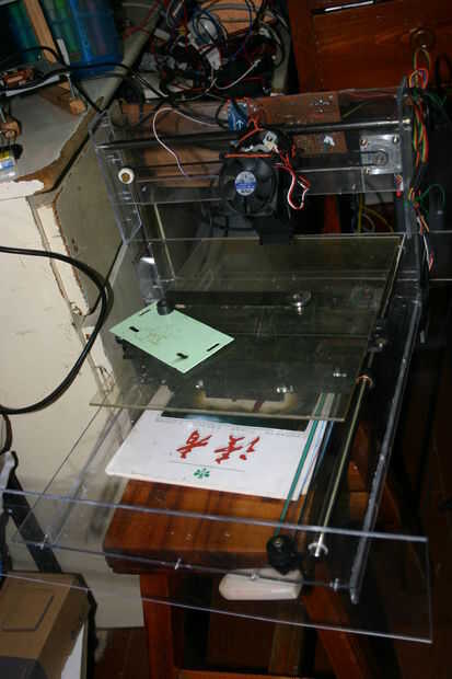 Porque era el único que hace esta máquina, no guardo muchas fotos del proceso de elaboración cuando hice una segunda generación. Éste fue hecha desde una impresora desperdiciada y desechados acrílicos con los mismo circuitos controlados de la primera generación, pero tiene un marco más grande de la máquina y el motor, que le permite imprimir cosas más grandes.