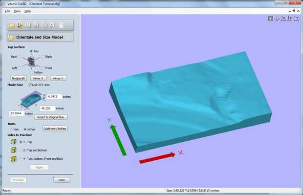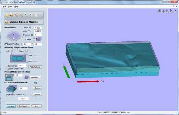 La siguiente tarea es convertir el archivo OBJ en trayectorias de herramienta que pueden ser leído por el ranurador CNC. El software que usé se llama Cut3D por Ventric. Comience abriendo el archivo OBJ. El software le lleva a través de un principio de proceso paso a paso con la instalación de materiales. Seleccione las dimensiones correctas para su proyecto.