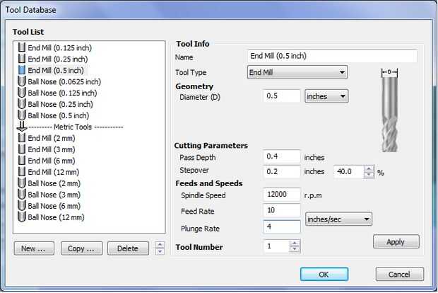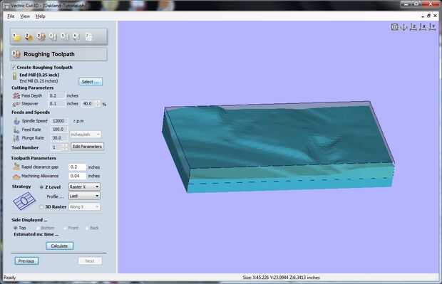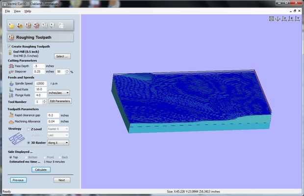 Para empezar, seleccione la herramienta que cortará con. Puesto que este proyecto es cortar en espuma, he seleccionado un poco grandes, una alta velocidad de rotación, y una alta tasa y tasa de penetración de la alimentación. Necesitará ejecutar este trabajo mucho más lento si se corte material más denso. Para acelerar aún más el corte de este trabajo, he seleccionado a trama 3D a lo largo del eje X, que calcula a un tiempo de corte aproximado de 1 hora 8 minutos.