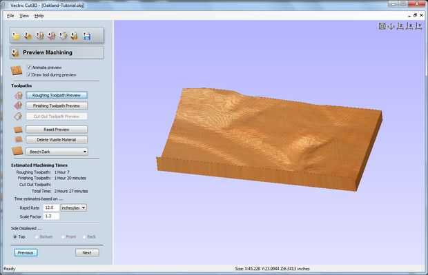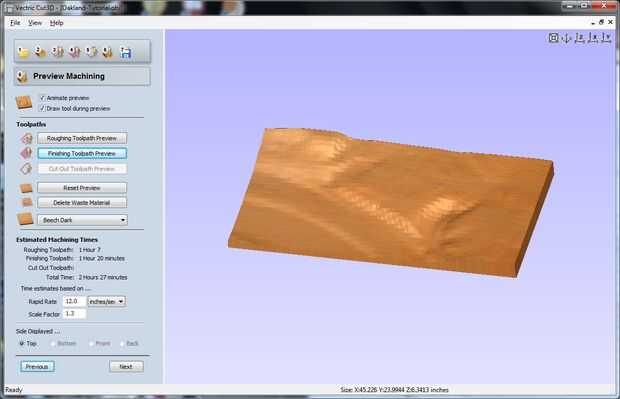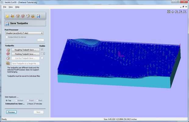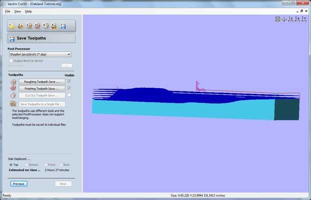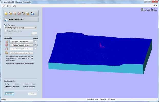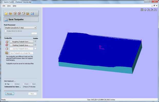 Lo interesante es que en la presentación de la trayectoria de herramienta de acabado, la superficie de la poligonal que conforma el mapa de contorno del mapa de Google es visible. Sería interesante obtener datos de contorno de otra fuente para eliminar posiblemente este tallado.