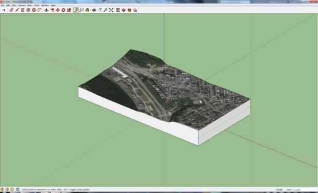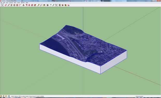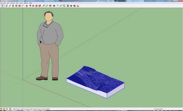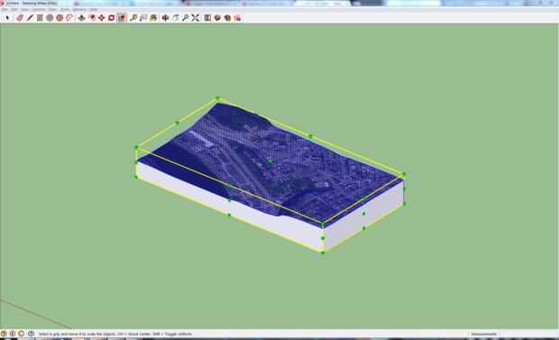 Utilice la herramienta "Cinta métrica" para hacer la nota de la dimensión de limitación. Para todo el modelo de la escala, usar una calculadora para encontrar el cociente de la escala y redimensionar el modelo dentro de unos pocos pies de las dimensiones finales que desee. Desde el modelo inicial fue escalado a la dimensión de la región real que usted seleccionó, tal vez cientos de millas cuadrada, esta escala debe de ser un paso de proceso, limitado por el número de dígitos de precisión que puede escribir en Sketchup. En este caso, la dimensión de limitación fue escalada a dos pies, la mitad del ancho de un bloque de cuatro por ocho pies de espuma.