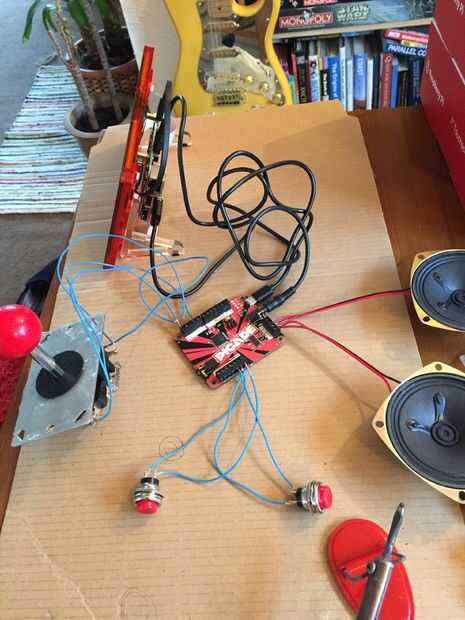 Conectado sólo 2 botones y la y derecho cambia en el joystick. Ninguna soldadura, torcido a extremos. La prueba fue un éxito como he podido jugar Pitfall, ahh los recuerdos vinieron inundaciones nuevo! Cables fueron luego (después de una minuciosa prueba de trampa obviamente!) soldados en los altavoces y bien probado demasiado.