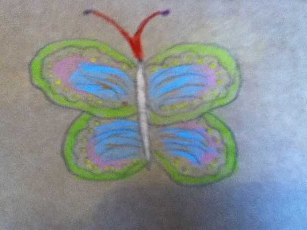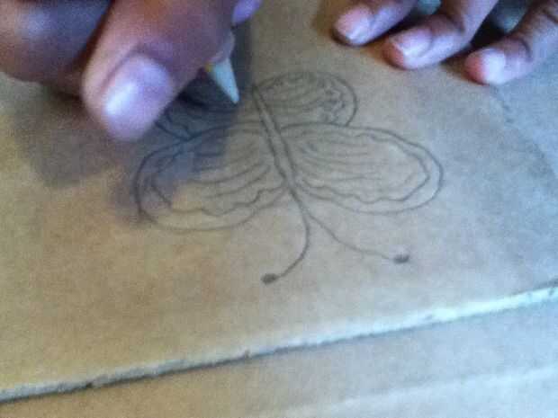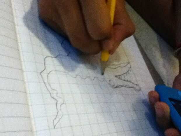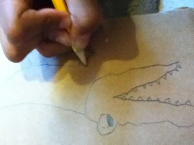 Primero dibujamos el cocodrilo y la mariposa en el libro primero y que color lo. Cuando terminamos el dibujo y el color nos dibuja en el cartón y el color que