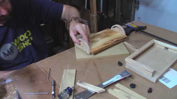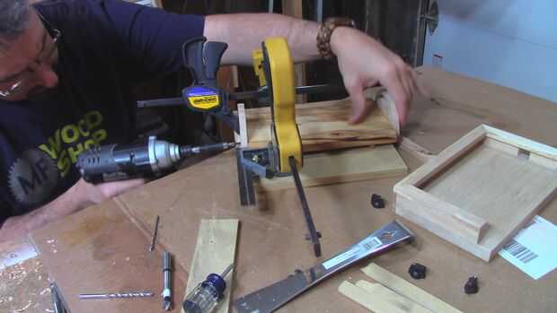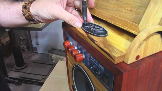 montaje de la iPad: comienza con una base para mi iPad. Diseño y corte los soportes de ajuste en la CNC al construir el soporte iPad. El soporte es una placa de soporte con palo de madera que rodean el iPad, dejando espacio para los conectores del cargador y auriculares. Los palillos era un poco más alto entonces el iPad. Luego había recortado la parte superior con piezas a inglete. El ajuste PRE taladro se monta, se rompió uno y tuvo que lo coinciden. Montar uno a cada lado, asegurándose de que son paralelas entre sí. Lugar el iPad mantenga entre los montes y taladre para pernos de 1/4 de suspensión. En un lado del tornillo del soporte el perno de suspensión. Luego inserte el soporte en su lugar. A continuación Alinee el orificio taladrado de pre en el soporte con la ranura de montaje. Inserte el otro perno de suspensión. Por último atornillar las perillas de trabazón. La placa base es donde se montar la placa del logotipo Peavey. En el centro y al frente.