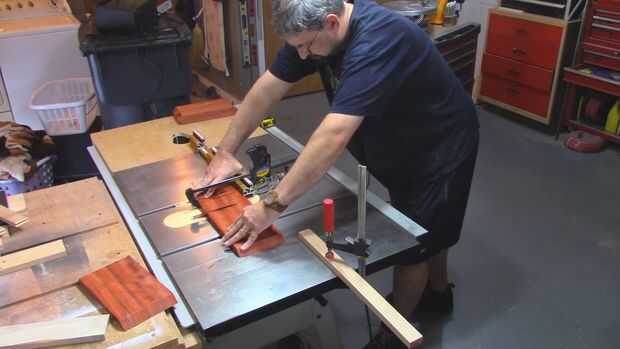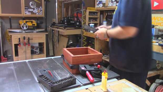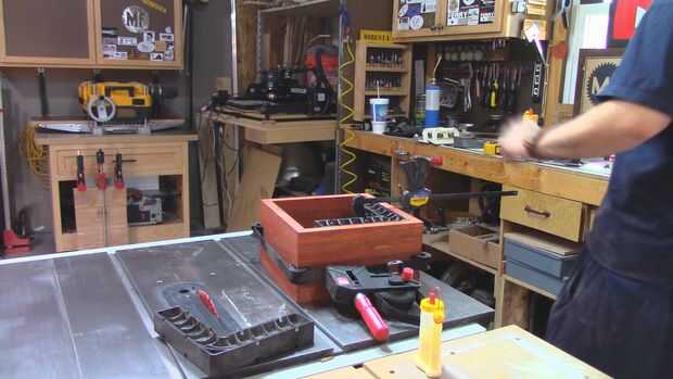 Usé el Padauk para hacer sobre que todo de la caja. Otra vez esto va a dimensionarse para el amplificador que usas. En mi caso la caja deba ser cuadrado. Necesitaba cuatro pedazos del mismo tamaño con 45 grados ingletes en ambos extremos. Esto suena fácil, pero si tu me puede ser difícil. Configurar un bloque de tope en el lado izquierdo de la hoja marcado en un lado. Una vez configuración me encontré las otras tres partes y había pegado encima. Asegúrese de que este paso es perfectamente cuadrado. Es importante más adelante en el proyecto