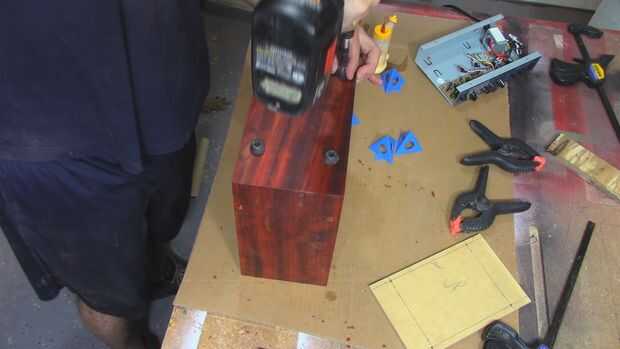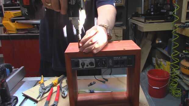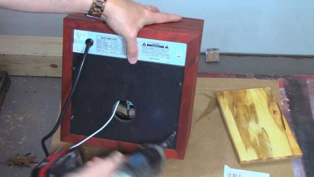 La parte posterior del amplificador. Tuve que añadir piezas de desecho de madera para montar la placa de soporte. Entonces utiliza los pies de la vieja amp y la misma plantilla de taladro la puso en los pies. Luego montar el amplificador. Fui una cabeza y poner el respaldo en ayudar con polvo. Se trataba de la misma placa de respaldo del viejo amplificador, simplemente repintado. Aquí puede ver el cable del iPad que sale la parte de atrás.