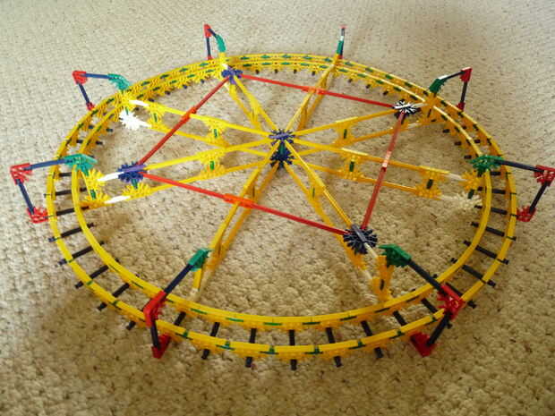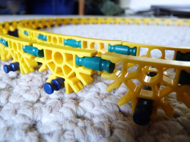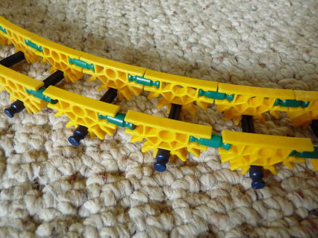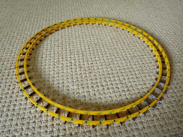 1: hacer la... pista. Tiene 48 conectores amarillos en su interior y 48 en el exterior. La pista interior es sólida, pero el exterior no está conectado. Su hizo de amarillos + barras verdes. Vea las siguientes dos fotos para ver lo que me refiero.
