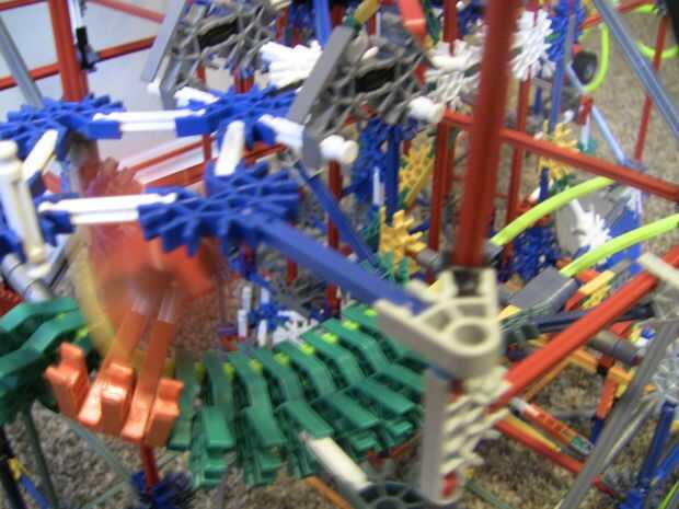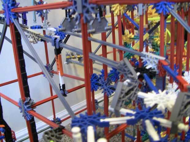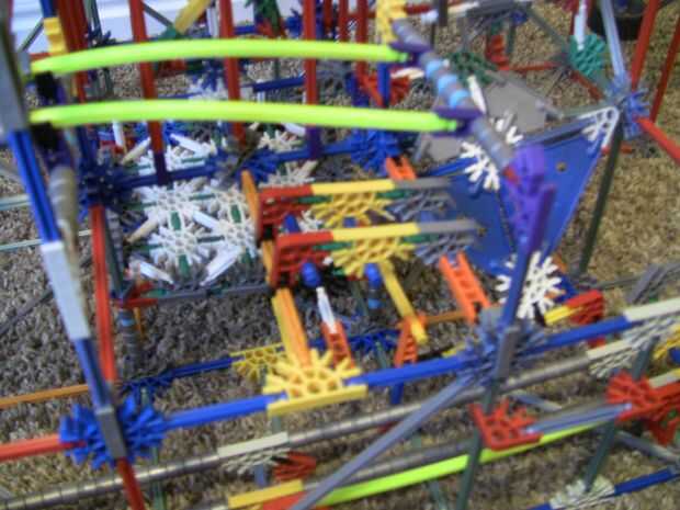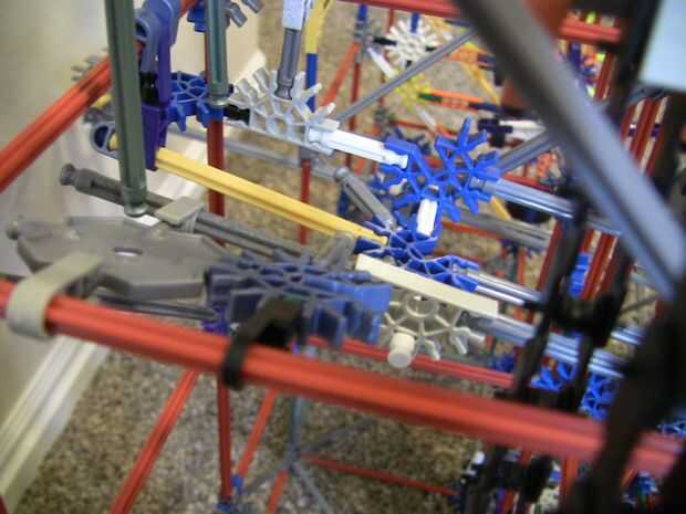 Ruta 3 fue la última que he construido, tenía apenas cualquier pieza a la izquierda. Es una caída libre, y luego rutas un poco con algunos de los paneles que la bola golpea cuando se va, entonces la pelota cae por un agujero y en un camino de conector verde, cae a través de algunas varillas flexi a continuación, vuelve a los ascensores.