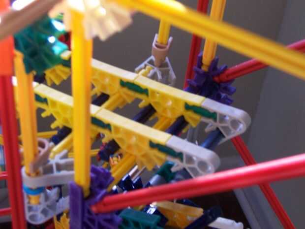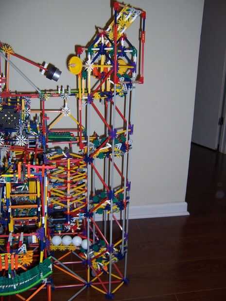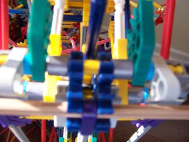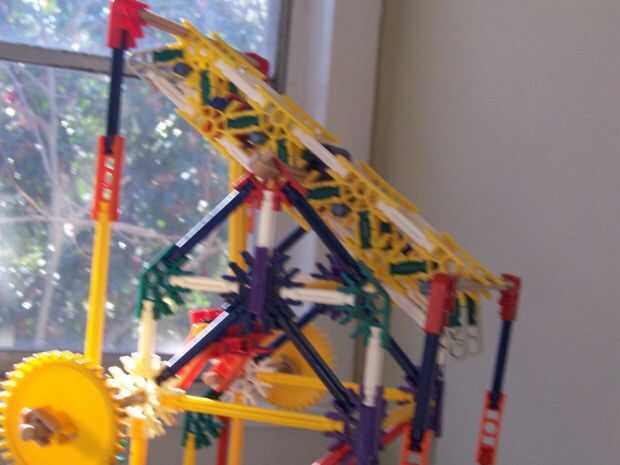 Desde siempre construyo en una estructura de soporte de la barra roja, esta elevación que plantea varios desafíos de diseño. Tuve que conseguir el ascensor para conectar con el resto de la máquina. Colocado en la altura de la barra gris 4 porque 5 barras rojo es aproximadamente igual a 3 1/2 gris barras... que era la altura de un lado del ascensor. Simplemente pongo varillas de conexión a través de la brecha.