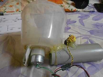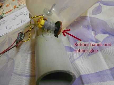 Hacer otro agujero en la tubería de PVC para la rueda de goma y arreglar el motor de la C.C. 6V como se muestra. La rueda debe entrar en el agujero lo suficiente como para cepillar la bola cuando cae a través del tubo. Utilice una cantidad generosa de pegamento caliente para mantener el motor bien.