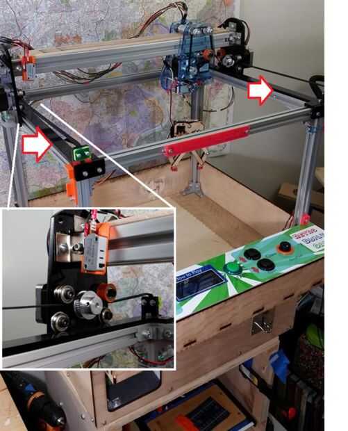 Una característica de diseño muy importante son los rieles del bastidor negro ajustable el pórtico paseos en. La última foto señala estos rieles que pueden moverse hacia adentro y hacia afuera. Estas guías sirven como el compensador de factor de fudge. Esto asegura, que cualquiera que sea el ancho de pórtico es (usted sólo consigue así muchas posibilidades cortar el aluminio) que podemos hacer que funcione para nuestro sistema. Los rieles del bastidor pueden mover y salir a montar las ruedas de montar a caballo (con rodamientos). También ajustan en caso de que el marco está fuera de escuadra, aunque no tengo este problema con el marco de Al. Si se construye con madera de la máquina Asegúrese de que todo es cuadrado!