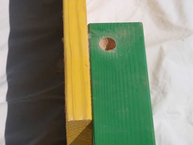 2. Perfore los agujeros piloto, luego atornille los 2 10.5" las piezas en su lugar (ver fotos) con los tornillos de 3". Esto ayuda a tener una de las piezas verdes de madera apuntalar el otro extremo de la tabla amarilla para que quede nivelado.