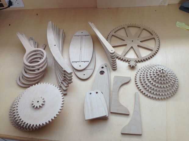 En la foto ver los engranajes y otras piezas que he realizado en contrachapado de abedul.