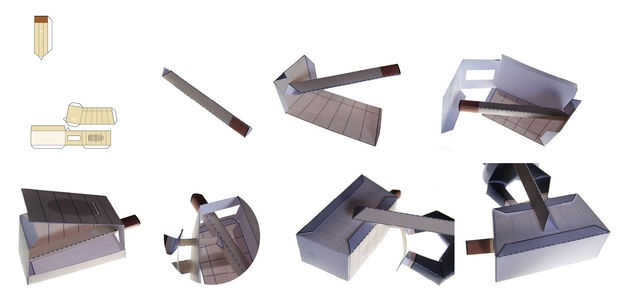 Primero el tubo triangular y pegar la aleta en la parte de atrás. Luego pegue el lado largo en la parte inferior a la parte grande, empuje la palanca a través del orificio y pega cada aleta de otros a pesar de que la capa superior (cuadro parte inferior izquierda).