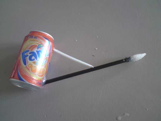 a continuación pegar la paja en el poder manteniendo la paja en el ángulo requerido y el otro extremo por encima de la altura de la parte superior de la lata y luego tome una de las manijas de la cuchara y pegamento entre la can y el surtidor (de paja).
