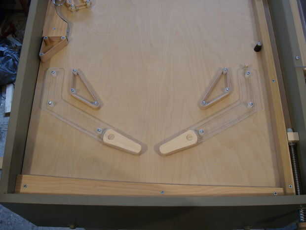 Usted necesitará un 22" largo por 2" gran pedazo de madera. Medida siguiente a la derecha corto Mida 1" desde abajo y trazar una línea desde esta marca a la esquina superior izquierda. A continuación cortar esta línea. Ahora ponga el extremo grueso a la izquierda de la máquina de pinball y el lado más largo hasta el final contra la parte delantera de la máquina de pinball. Una vez hecho esto que usted puede perforar previamente y contador del fregadero tres agujeros uniformemente espaciados a lo largo de esta pieza de madera de una profundidad de 1 1/4" y atornillar con tornillos para madera de 1 1/4".