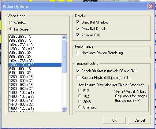 al descargar algunas tablas. Asegúrese de que son mesas gabinete pantalla completa. agregar las tablas a la carpeta de tablas en el Visual Pinball. abrir el Visual Pinball, tienes que hacer y la opción de vídeo que tienes pantalla completa comprobado, tu resolución de pantalla seleccionado y 1024 en dimensiones de textura (ver imagen abajo). Reinicie el programa, ir a archivo/abrir y abrir una tabla. En la barra de herramientas izquierda, seleccione Reprod. presentará un cuadro diciendo que necesitas un rom para jugar al juego. Buscar en el cuadro de 'ROM set nombre' y le dirá el nombre de la rom que necesitas. Descargar él y añadirlo a... visuales pinball/vpinmame/roms. Lamentablemente, esta es la única manera que conozco para encontrar el conjunto derecho rom. un montón de mesas sólo tienen una ROM, así que su digno de la comprobación hacia fuera primero. también puede descargar todos los roms de la tabla. una vez que la rom está en el lugar correcto, tratar de jugar al Juego de nuevo. usted conseguirá un acuerdo legal emergente. Haga clic en sí y el juego está listo para jugar. a veces es necesario abrir el juego dos veces, porque la primera vez emula una restauración del sistema para la tabla y necesita reiniciar. sólo tiene que pulsar escape, salga al editor y luego el juego otra vez.