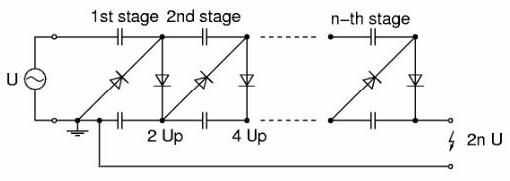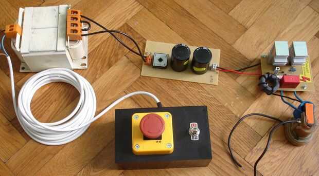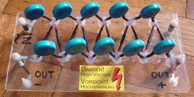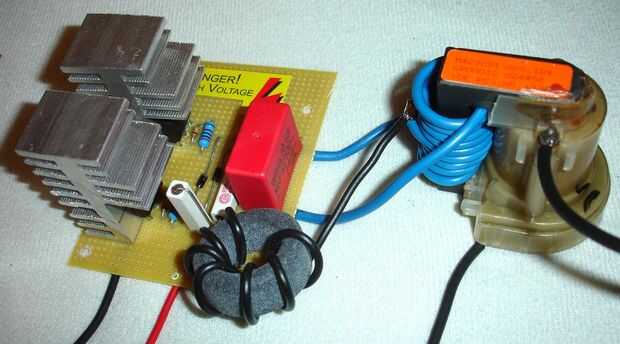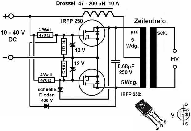 Para producir rayos x utilizando un tubo rectificador de vacío simple necesita una fuente de alimentación de alto voltaje. Utilizar el popular circuito ZVS, un transformador flyback de AC y una cascada para aumentar la tensión de salida hasta 50-60 kV. Para la cascada tomé 20kV/5mA diodos y condensadores de 10nF/20kV. También necesitarás un transformador potente (ej. un 12V/250VA como la mía).