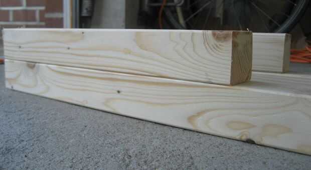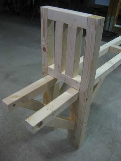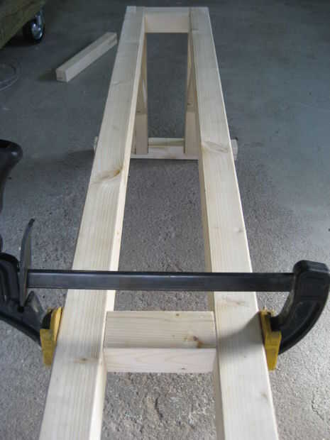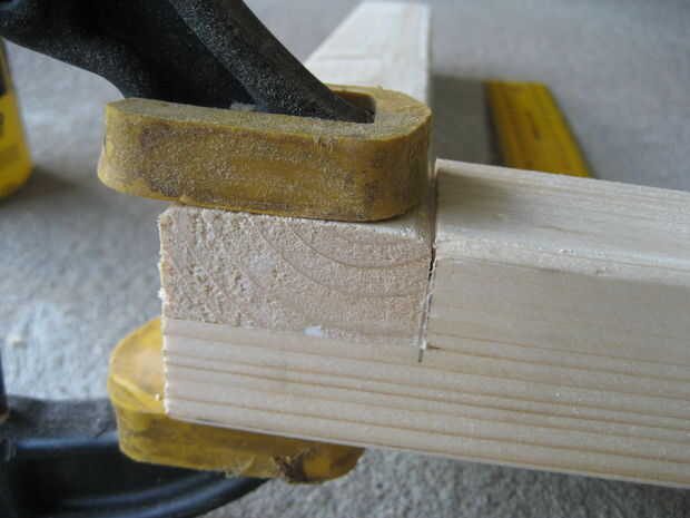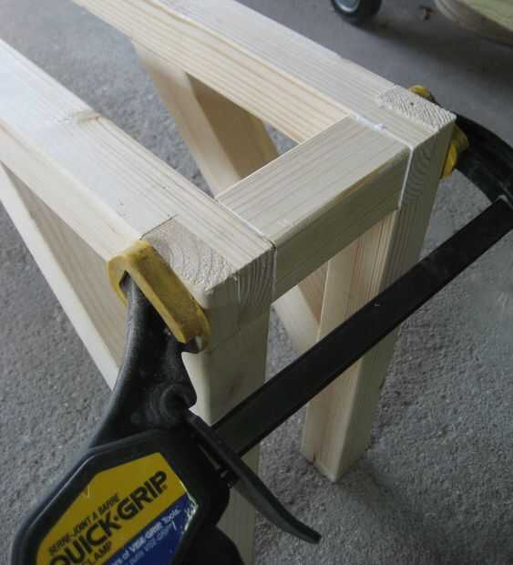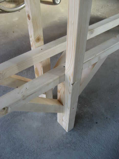 Sierra de rectángulos (4 cm x 4 cm x 2 cm) de los extremos de las longitudes de 170 cm y las piezas de 40 cm. Pegue los extremos aserrados de las longitudes de 170 cm y las piezas de 40 cm en ángulo recto. Tornillo de dos piezas de 30 cm (las que con el ángulo de 45° aserrado) en las esquinas del rectángulo.