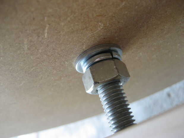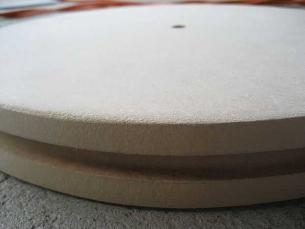 Dibujar (en el tablero del MDF) dos círculos 32 cm de diámetro y 30 cm de diámetro de un círculo y Sierra de calarles hacia fuera. Pegar juntos dejando a uno más pequeño de 30 cm en el centro. Perfore un agujero de 12 mm en el centro del círculo. Perno de la rueda creada en los orificios perforados en la parte posterior de la base.