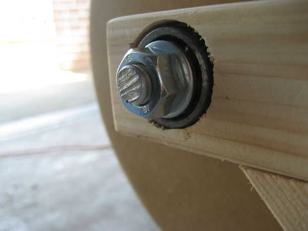 Colóquese los cojinetes en los agujeros de perforado 32 mm. Utilice arandelas, arandelas, tuercas y un threadedrod para conectar la polea de madera a la base.