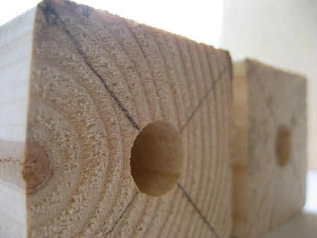 Tomar las dos piezas de sobra 10 cm desde el paso 1. Perfore un agujero de 12 mm a lo largo de la parte superior de cada pieza. Tornillo en el centro de cada 26 cm por pieza de 12 cm.
