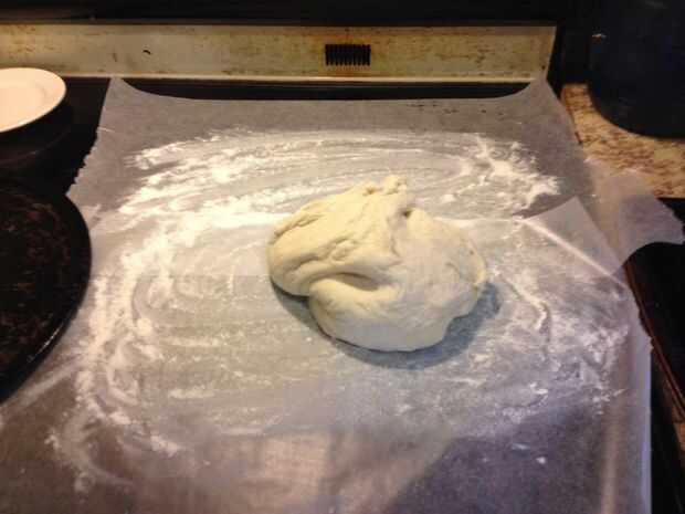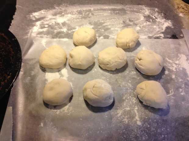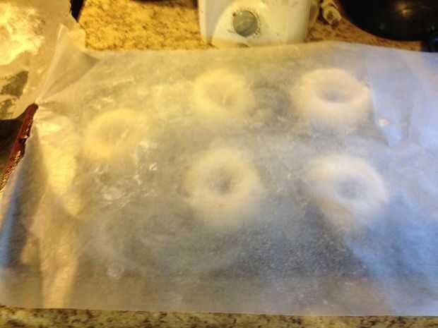 Cuando la masa esté lista, volcar hacia fuera sobre una superficie ligeramente enharinada. Me gustaría poner papel encerado para evitar un desastre. Dividir la masa en nueve pedazos. Roll en bolas. Tire suavemente sobre un agujero de una pulgada en el centro de cada bagel. Lugar de las hojas para hornear engrasadas, cubierta ligeramente para que las rosquillas no seque y deje reposar durante 30 minutos.