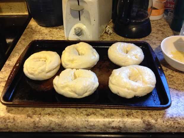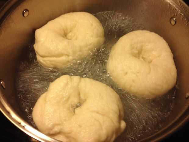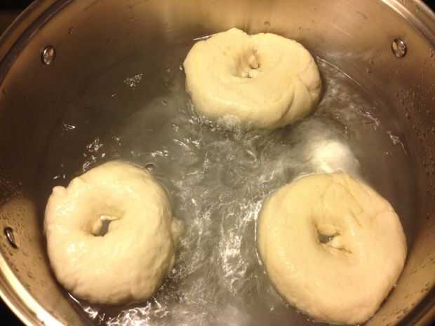 Mientras aumentan los bagels, traiga una olla grande de agua a hervir. Con mucho cuidado poner unos bagels en hervir, unos 3 minutos por cada lado. Los bagels va a poof hasta considerablemente durante este paso. Muy cuidadosamente usando una cuchara ranurada, drenar los bagels y volver en la bandeja de hornear engrasada. Cepillo con huevo y espolvoree con los aderezos si usted elige. Hornee a 400 grados durante unos 20 minutos. Enfriar en rejillas de alambre.