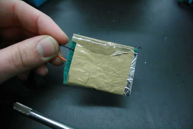 Coloque la combinación de alambre de aluminio de dos lados de la almohadilla para fregar y sujetarlos con un trozo de cinta.