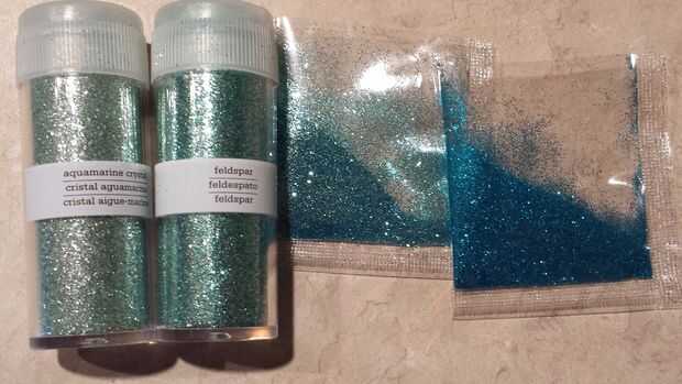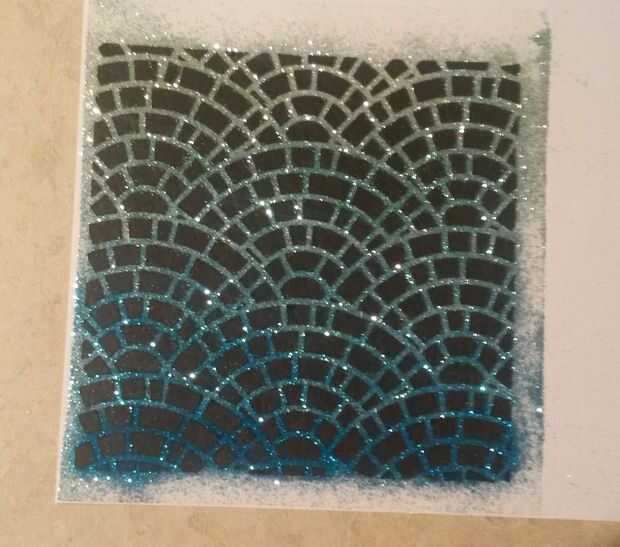 Porque el contorno del vacío era pegajoso por el adhesivo de sookwang, fue la oportunidad perfecta para una de mis técnicas favoritas: mezcla de brillo. El brillo tiene que ser extra fino en textura - me gusta Martha Stewart Crafts, y también las cajas encontraron la sección de arte general Michael que vienen en pequeñas bolsitas de plástico claro. A partir de la parte inferior, había salpicado el color más oscuro y había frotado en el adhesivo con mi dedo índice. Pasando posteriormente al siguiente color más claro, comprometido por el borde del color más oscuro a los colores se funden entre sí. Repetí esto para crear un efecto de ombre de 4 colores.
