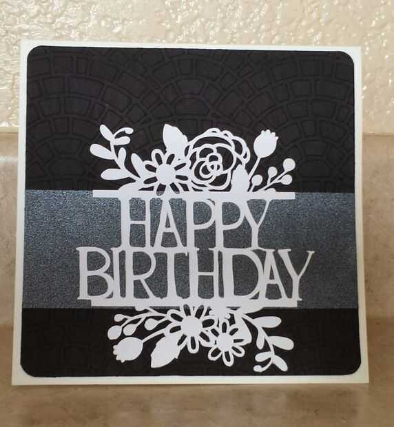 En este punto tuve 3 fondos cool: corta la cartulina negra con la imagen en él, el fondo acabado brillado, y respaldado por el contorno con papel de color. Volví a la tienda de diseño de silueta y descargaron un broche de oro de cumpleaños (como te voy a regalar la tarjeta terminada a un compañero de trabajo de uso personal) y utiliza la silueta para cortar en cartulina blanca usando la profundidad 7 ajuste de la hoja. Recortar un poco por el fondo negro y usa un punzón para redondear las esquinas. He añadido una tira de cartón gris brillo detrás el blanco cortado para añadir contraste.
