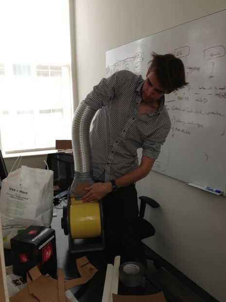 Ahora que está construido su podio, usted necesita conectar la tubería al ventilador. En nuestra versión, hemos utilizado algunos básica de cartón y cinta adhesiva. Simplemente crear una Junta de igual forma alrededor de la salida del soplador cinta las costuras alrededor de él y conectar la tubería. Asegúrese que los sellos estén apretados porque no desea perder cualquier presión de aire.