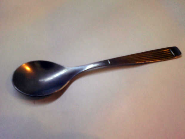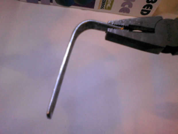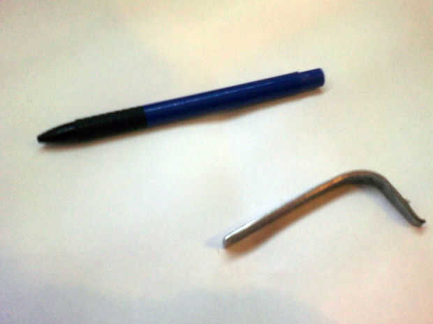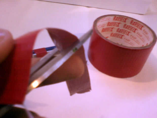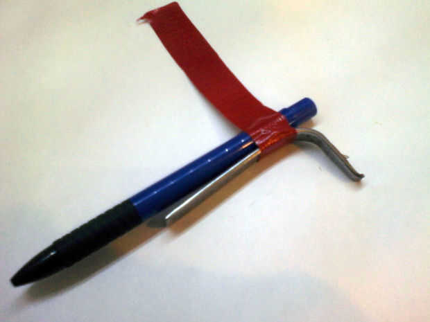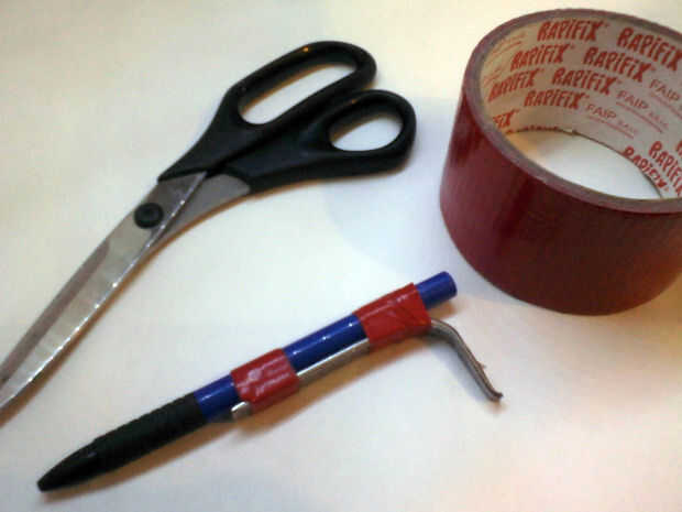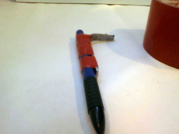 La pieza de metal o de la cuchara del doblez en "L" y pegarlo al lápiz con cinta.