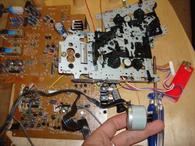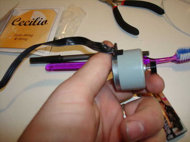 he encontrado mina en una máquina de grabación en cinta. He oído que motores de la máquina de cinta fueron la norma, pero también he oído de las máquinas del tatuaje de nintendo 64 rumble pack motores. Cuando usted encuentra su motor, rasgar hacia fuera y tome nota de los cables positivos y negativos. También rasgar el engranaje común unido a la biela del motor. Reemplazar el engranaje común con un borrador de lápiz mecánico a la aguja de la cuerda de guitarra.