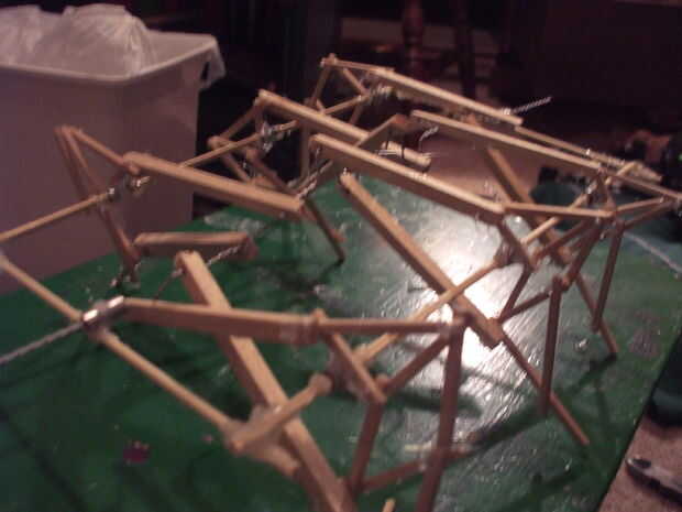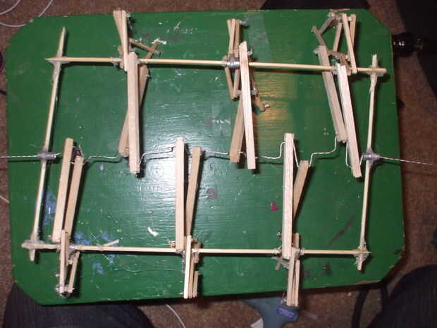 Construí este insecto caminando, inspirado en las creaciones de Theo Jansen , que utiliza un algoritmo genético para encontrar un conjunto de vínculos para formar una pierna donde el pie se mueve en un lugar conveniente para caminar. Lo que él vino p