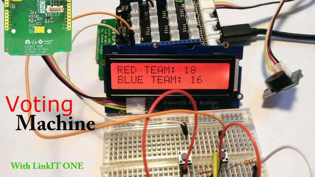 Para todos los maestros por ahí, tomando un voto de clase puede ser difícil a veces. Mantener un recuento de las diferentes manos que suben puede ser difícil, además de algunas personas que pusieron su mano arriba y abajo. Para contrarrestar ese problema, he creado una máquina básica. Esta máquina permite dos equipos diferentes (rojo y azul) para presionar un botón y voto. Cuando votan, se consiguen un tono audible (a través de nuestro timbre) para confirmar que su voto ha sido emitido. Luego, usted verá su voto demuestran para arriba en la pantalla LCD. El color de la pantalla indica qué equipo está actualmente a la cabeza.
