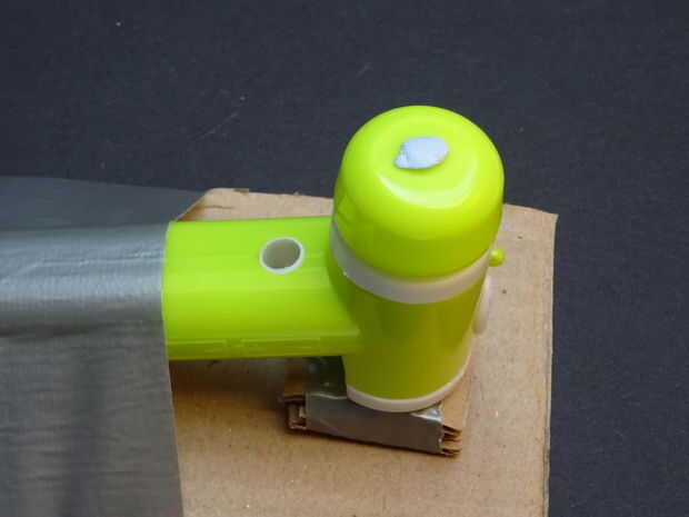 Coloque un poco de Blu-Tac en la broca que gira el ventilador y agregado la placa en el lado brillante del centro para arriba (ayuda con plumas)