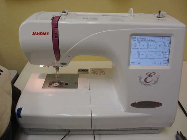 elegí diseños que fueron precargados en la máquina.  Deje que la máquina haga su cosa; girando los hilos como se pedía. Corrí fuera del hilo de la canilla y tristemente cuando recogí el bordado de la camiseta desalojada. He conseguido recuperarla y no es terriblemente sensible. Aprendí a dejar el aro bajo el pie; Suelte el cierre de anclaje y deslícelo suavemente fuera del camino de la caja de la bobina.