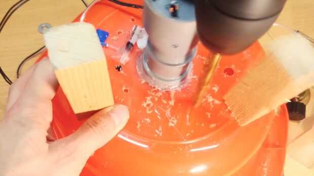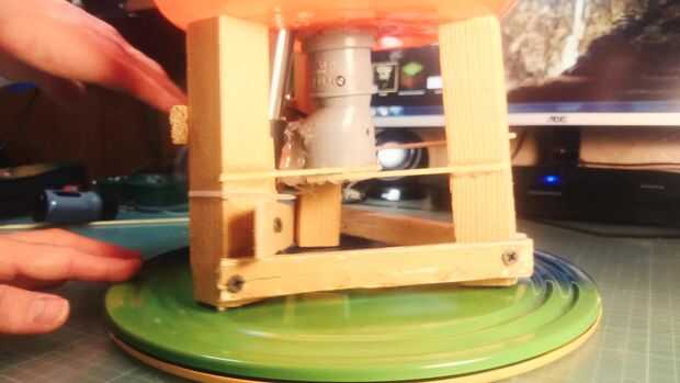 La parte más difícil es elegir el derecho de la fuente de calor, debe ser eléctrico, pero en este proyecto se utilizo un soplete. También nosotros debemos fortalecer pies de máquina para el montaje de un cilindro de gas. Ahora estoy haciendo un agujero grande para la boquilla de la antorcha. Y ahora, usando un montón de pegamento caliente, bridas y pinchos creará la base de la máquina fuerte estupenda. Llamé el caos de pegamento caliente.